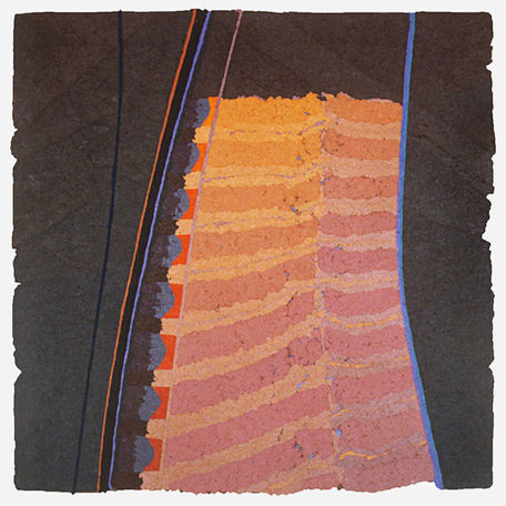 In 1982, I started working with the horizontal stripe, building a progression of hue and value changes using alternating abaca and cotton fiber. This configuration of free-cast paper led to many works we called "ladders." "Heavens Ladder" was selected by the American Craft Museum in New York for "Making Paper," the first East Coast comprehensive show of American papermakers. It is in the Museum of Art and Design's collection in New York. "Descending Angel" toured the United States in Poetry of the Physical, opening at the new American Craft Museum in New York, a show of works by 279 American craft artists.